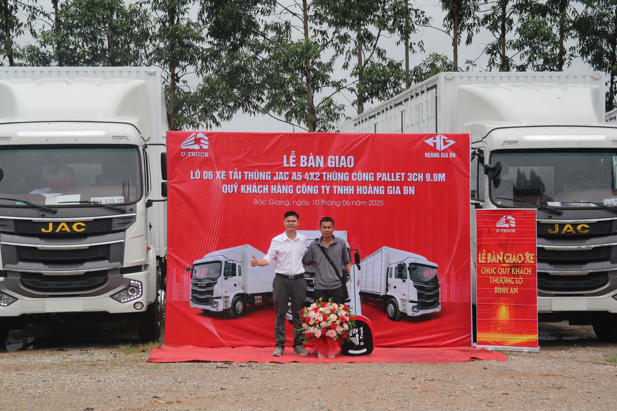 Ngày 10/06/2025 vừa qua, tại chi nhánh Bắc Giang, U-TRUCK đã chính thức bàn giao lô 06 xe tải thùng JAC A5 4×2 thùng công pallet 3CH 9.9M tới Công ty TNHH Hoàng Gia BN – một đơn vị vận tải uy tín, chuyên cung cấp dịch vụ logistics chuyên nghiệp tại khu vực miền Bắc.
