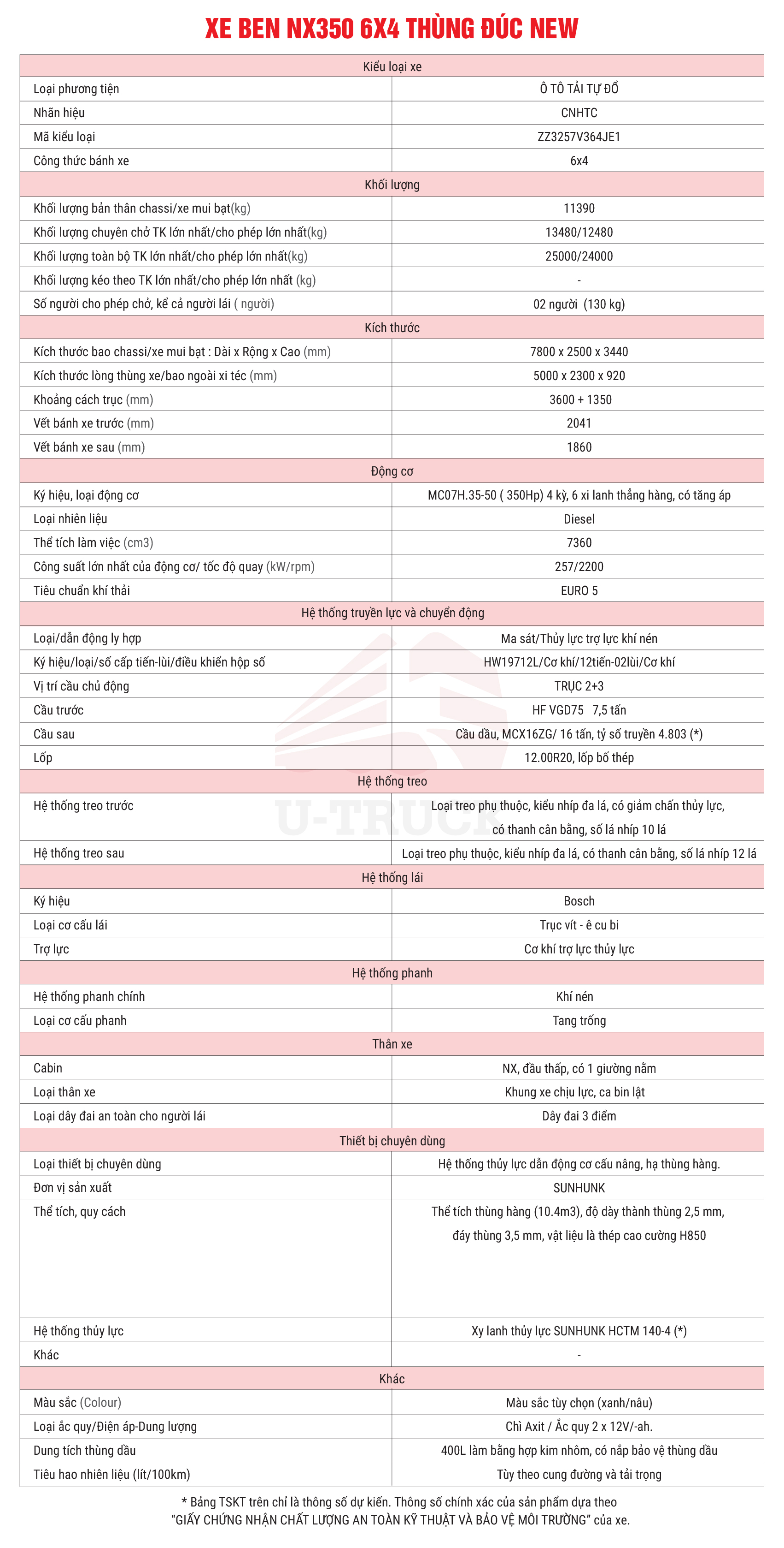 Xe ben HOWO NX 350 6X4 thùng đúc 3 chân là dòng sản phẩm HOWO MAN được nâng cấp từ sản phẩm VX. Xe có ngoại quan hoàn toàn mới, động cơ được cải tiến mới, phục vụ nhu cầu xe công trình, chạy san lấp mặt bằng, vận chuyển vật liệu xây dựng.