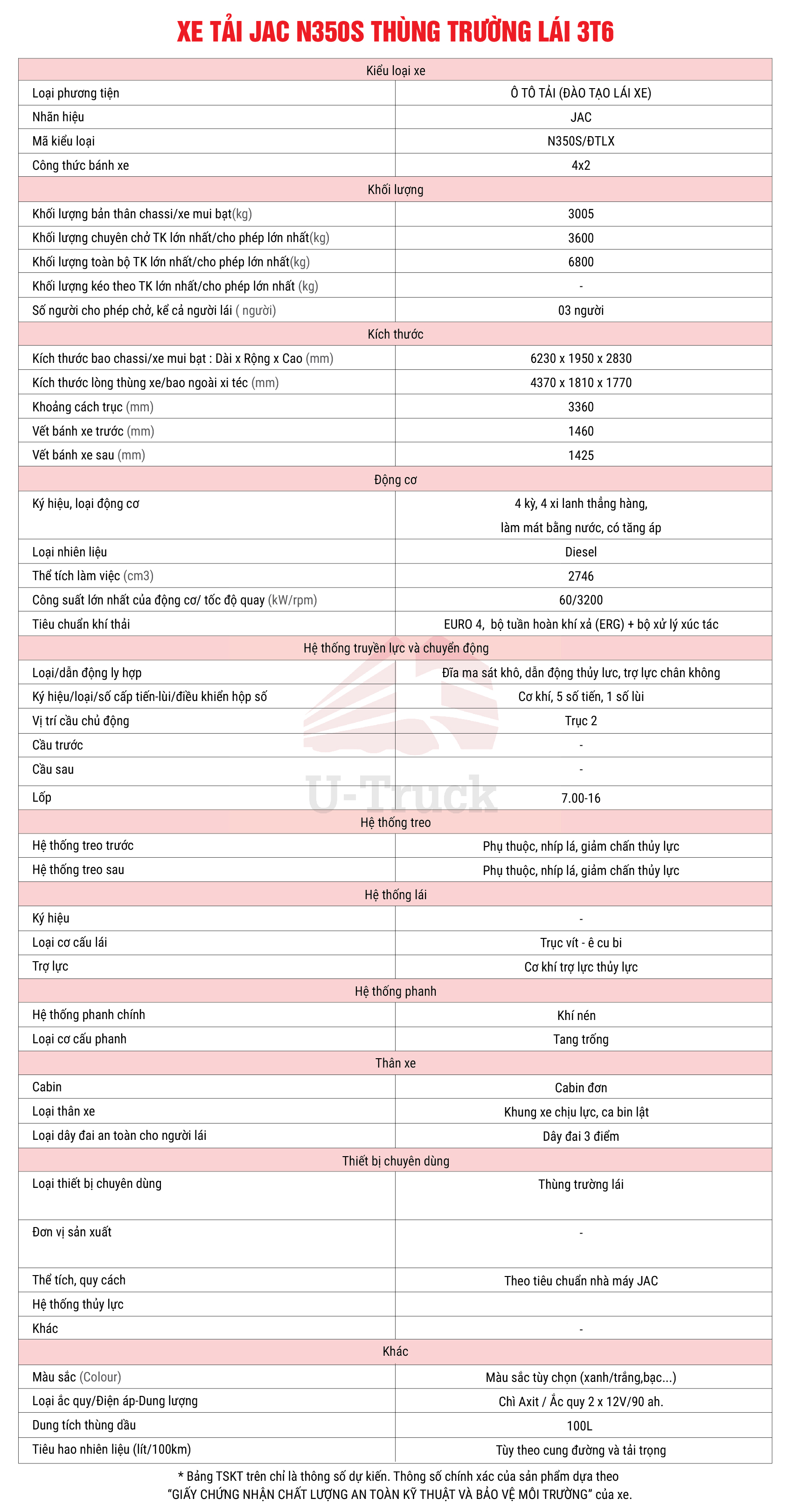 Xe tải JAC N350S Thùng trường lái 3T6 là sản phẩm của hãng JAC Motors được sản xuất để phục vụ nhu cầu dạy học lái xe trong trường lái. Điểm nổi bật của xe là sử dụng dòng động cơ tiết kiệm nhiên liệu.