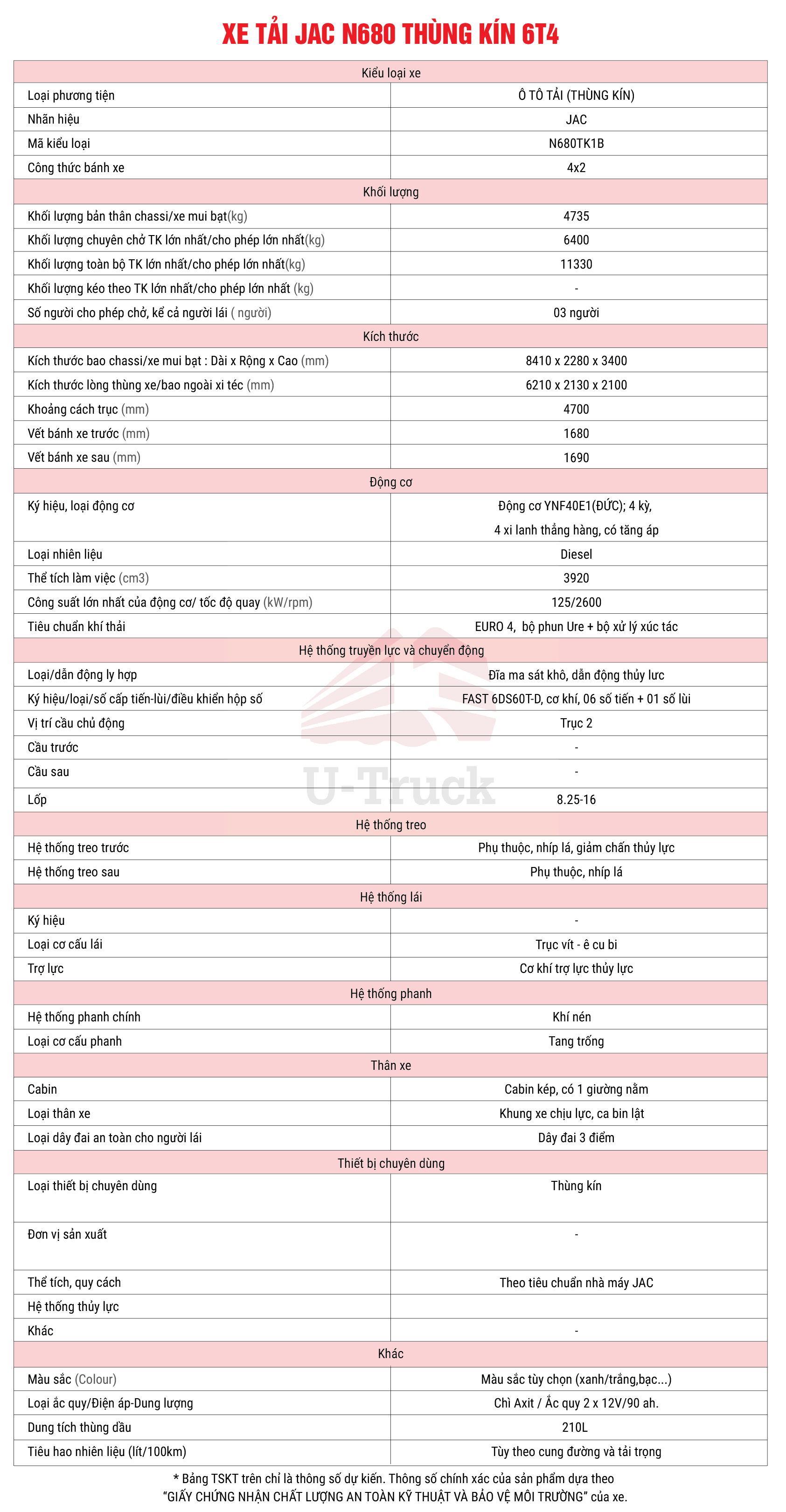 Xe tải JAC N680 thùng kín là dòng xe tải hạn trung với tải trọng cho phép 6,4 tấn. So với dòng JAC N650, xe tải JAC N680 đã có nhiều đổi mới, đặc biệt là ở hệ thống động cơ.